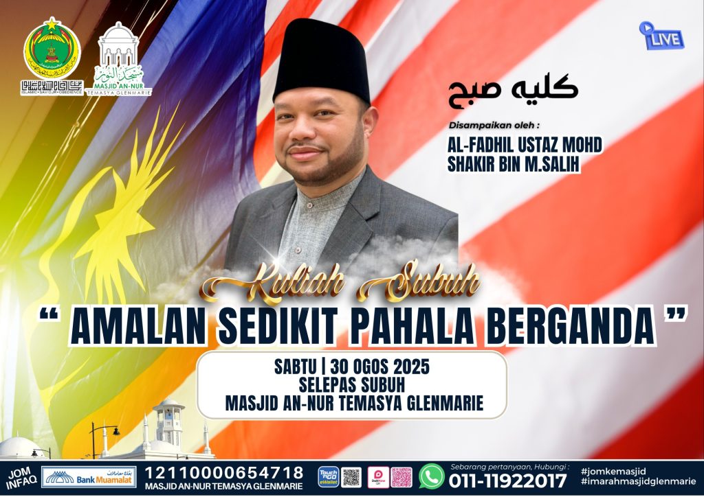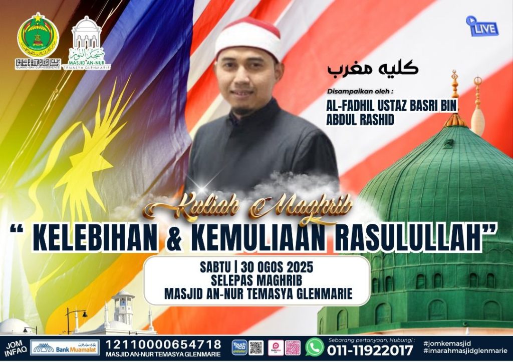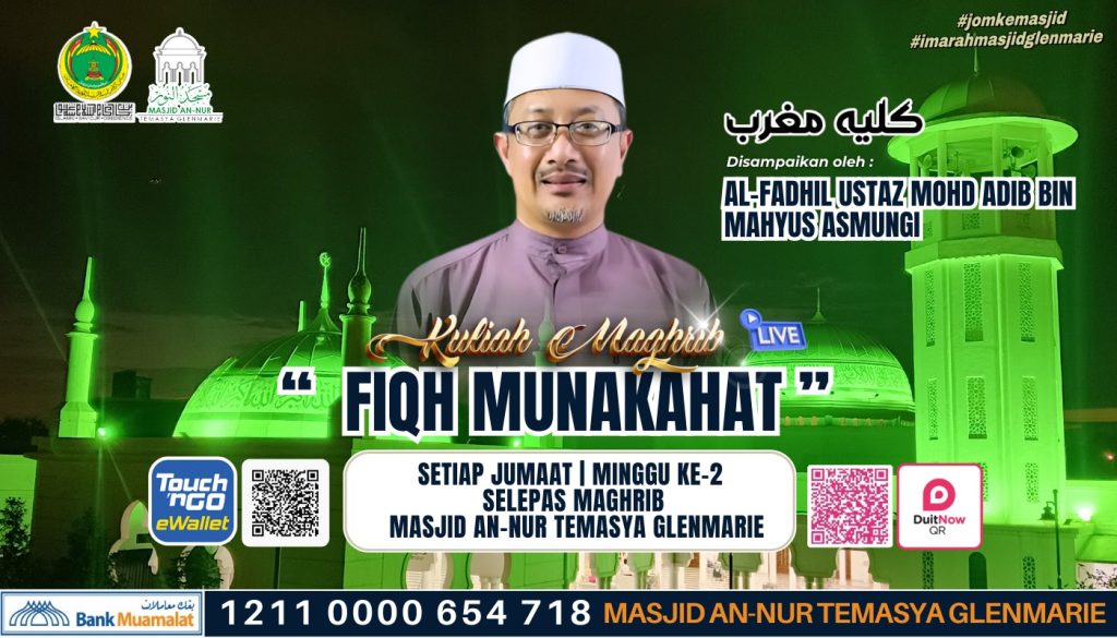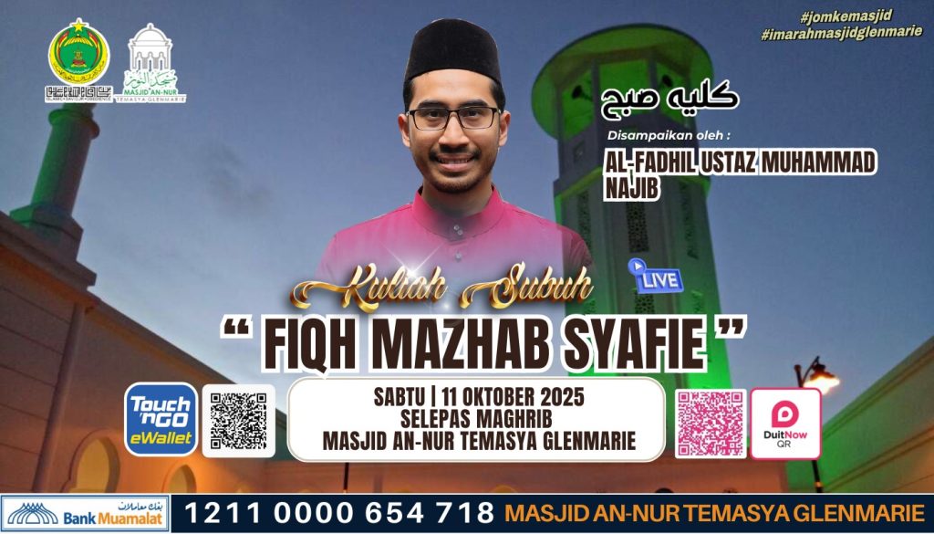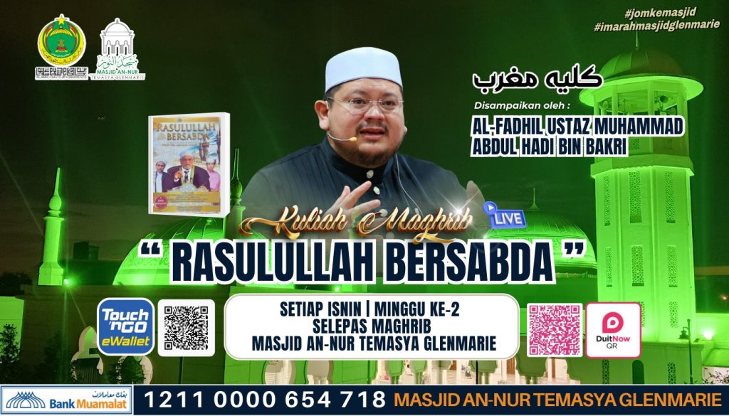 Kuliah Maghrib Masjid An-Nur Temasya Glenmarie : Isnin, 13 Oktober 2025 : Y.Bhg Ustaz Abdul Hadi Bakri : Kitab Rasulullah Bersabda : Selepas Solat Maghrib Like & Share Tiktok Masjid An-Nur Glenmarie |https://www.tiktok.com/@masjidannurglenmarie Like & Share FB Masjid An-Nur Glenmarie |www.facebook.com/masjidannurglenmarie/ Infaq Onlinehttps://toyyibpay.com/onlineinfaqmatg Infaq Majlis Ilmu | 562478174539 (Maybank) Infaq Operasi MATG | 1211 0000 […]