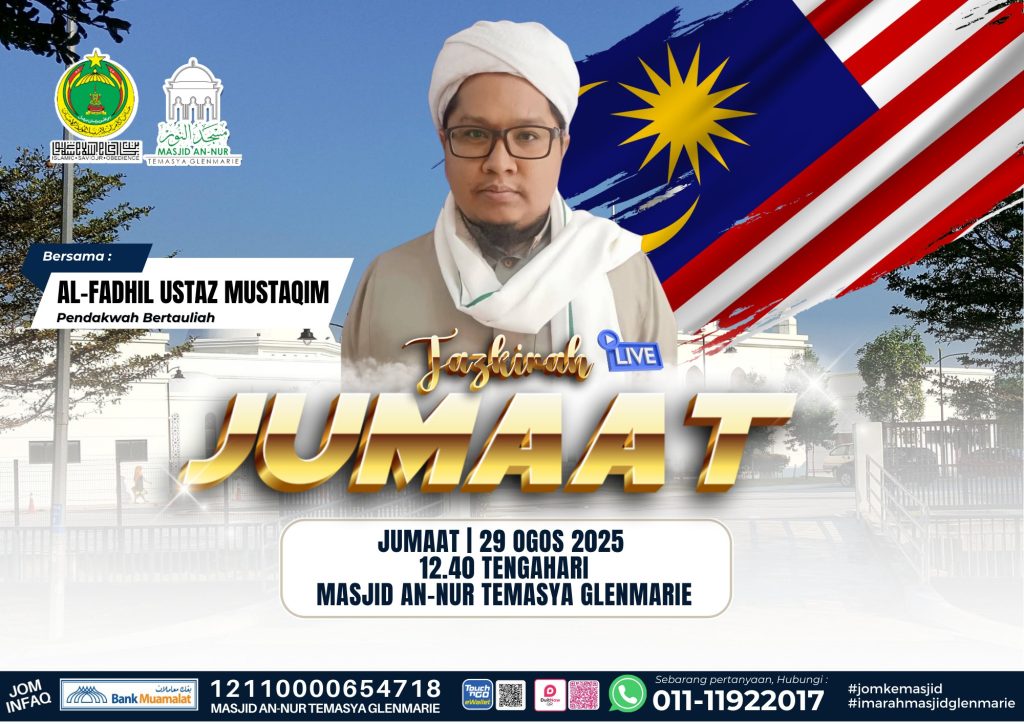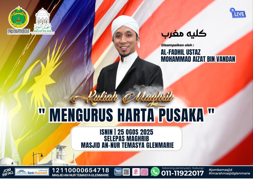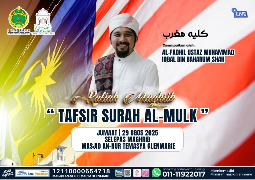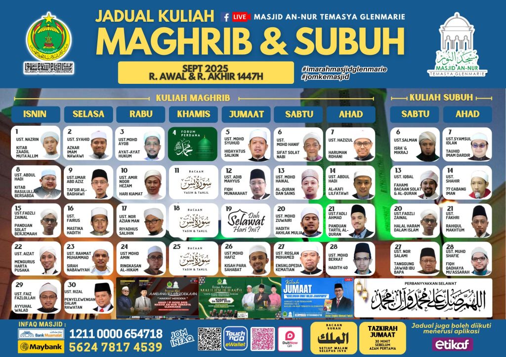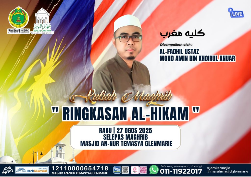 Kuliah Maghrib Masjid An-Nur Temasya Glenmarie : Isnin, 13 Oktober 2025 : Y.Bhg Ustaz Abdul Hadi Bakri : Kitab Rasulullah Bersabda : Selepas Solat Maghrib Like & Share Tiktok Masjid An-Nur Glenmarie |https://www.tiktok.com/@masjidannurglenmarie Like & Share FB Masjid An-Nur Glenmarie |www.facebook.com/masjidannurglenmarie/ Infaq Onlinehttps://toyyibpay.com/onlineinfaqmatg Infaq Majlis Ilmu | 562478174539 (Maybank) Infaq Operasi MATG | 1211 0000 […]