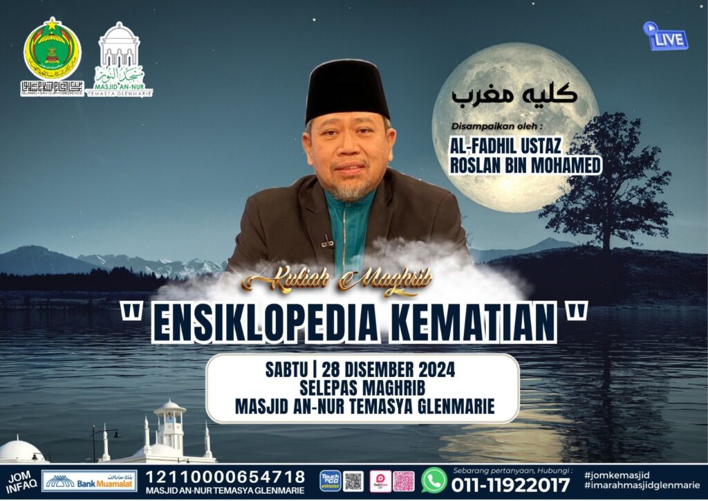 Kuliah Maghrib Masjid An-Nur Temasya Glenmarie : Sabtu, 28 Disember 2024 : Y.Bhg Ustaz Roslan bin Mohamed : Ensiklopedia Kematian : Selepas Solat MaghribMohon disebarkan, semoga beroleh kebaikan. Sekian, terima kasih.   #jomkemasjid#imarahmasjidglenmarie#sama2berdoa#semogadosakitadiampunkan#demikebaikanbersama#matg #jais. Hadirkan diri imarahkan Majlis Ilmu Taman-taman Syurga Allah.“Mengimarahkan Masjid Adalah Tanggungjawab Kita Bersama” Untuk makluman juga, pihak Masjid An-Nur Temasya Glenmarie