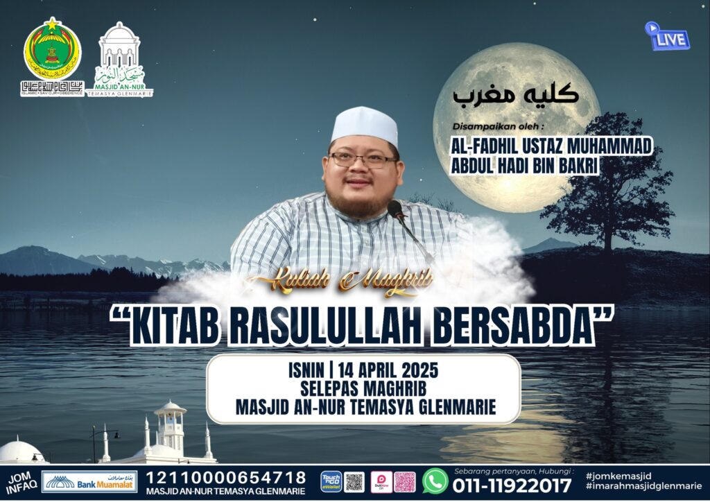Kuliah Maghrib Masjid An-Nur Temasya Glenmarie : Isnin, 14 April 2025 : Y.Bhg Ustaz Abdul Hadi Bakri : Kitab Rasulullah Bersabda : Selepas Solat Maghrib Like & Share FB Masjid An-Nur Glenmarie |Masjid An-Nur Temasya Glenmariehttps://www.facebook.com/masjidannurglenmarie?mibextid=zLoPMf Like & Share Tiktok Masjid An-Nur Glenmarie |Masjid An-Nur Temasya Glenmariehttps://www.tiktok.com/@masjidannurglenmarie… Infaq Majlis Ilmu | 562478174539 (Maybank)Infaq Operasi MATG