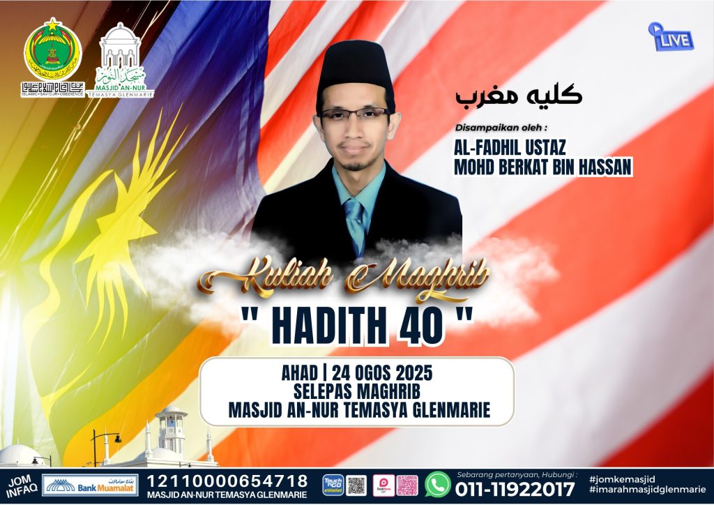 Kuliah Maghrib Masjid An-Nur Temasya Glenmarie : Ahad, 24 Ogos 2025 : Y.Bhg Ustaz Mohd Berkat Bin Hassan : Hadith 40 : Selepas Solat Maghrib Like & Share Tiktok Masjid An-Nur Glenmarie |https://www.tiktok.com/@masjidannurglenmarie Sertai Group Whatsapp Info Masjid An-Nur Glenmarie |https://chat.whatsapp.com/88cWICrNmviAcFmwlxe9BQ Infaq Onlinehttps://toyyibpay.com/onlineinfaqmatg Infaq Majlis Ilmu | 562478174539 (Maybank) Infaq Operasi MATG | 1211 0000 […]