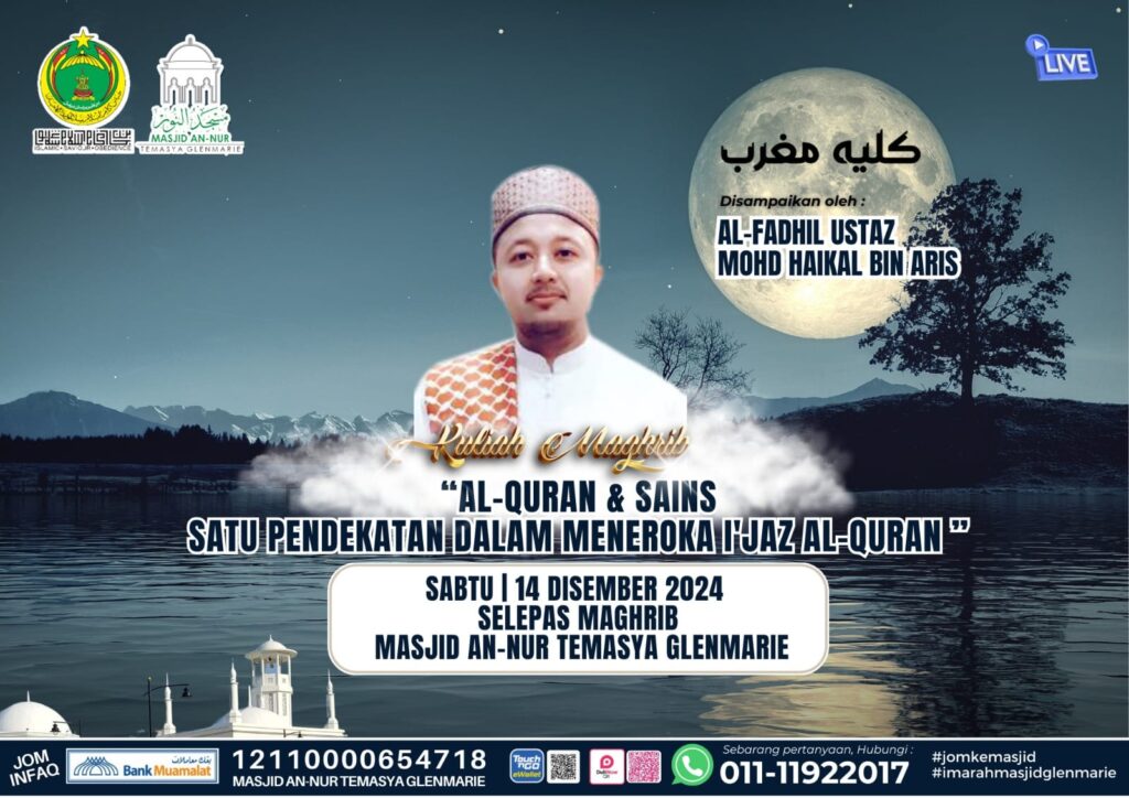 Kuliah Maghrib Masjid An-Nur Temasya Glenmarie : Sabtu, 14 Disember 2024 : Y.Bhg Ustaz Mohd Haikal bin Aris : Al-Quran Dan Sains Satu Pendekatan Dalam Meneroka I’jaz Al Quran : Selepas Solat MaghribMohon disebarkan, semoga beroleh kebaikan. Sekian, terima kasih. #jomkemasjid#imarahmasjidglenmarie#sama2berdoa#semogadosakitadiampunkan#demikebaikanbersama#matg #jais. Hadirkan diri imarahkan Majlis Ilmu Taman-taman Syurga Allah.“Mengimarahkan Masjid Adalah Tanggungjawab Kita […]