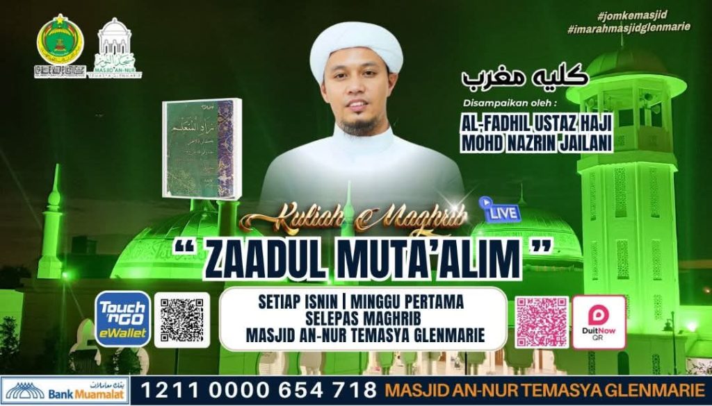 Kuliah Maghrib Masjid An-Nur Temasya Glenmarie : Isnin, 13 Oktober 2025 : Y.Bhg Ustaz Abdul Hadi Bakri : Kitab Rasulullah Bersabda : Selepas Solat Maghrib Like & Share Tiktok Masjid An-Nur Glenmarie |https://www.tiktok.com/@masjidannurglenmarie Like & Share FB Masjid An-Nur Glenmarie |www.facebook.com/masjidannurglenmarie/ Infaq Onlinehttps://toyyibpay.com/onlineinfaqmatg Infaq Majlis Ilmu | 562478174539 (Maybank) Infaq Operasi MATG | 1211 0000 […]
